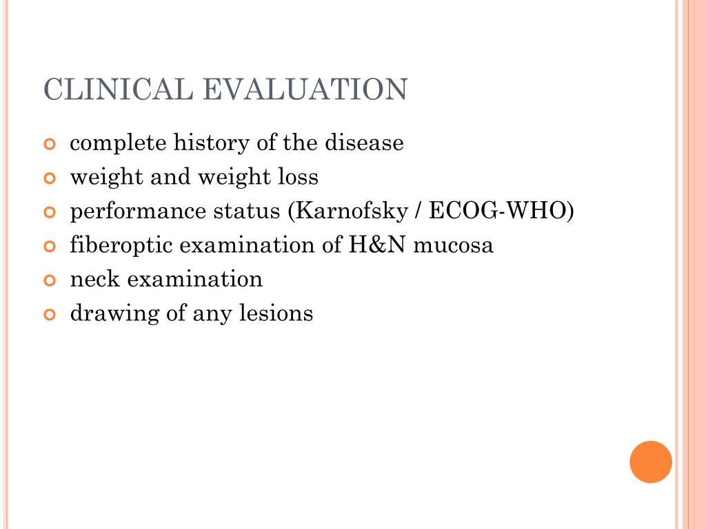 CLINICAL EVALUATION • complete history of the disease • weight and weight loss • performance status (Karnofsky / ECOG-WHO) • fiberoptic examination of H&N mucosa • neck examination • drawing of any lesions