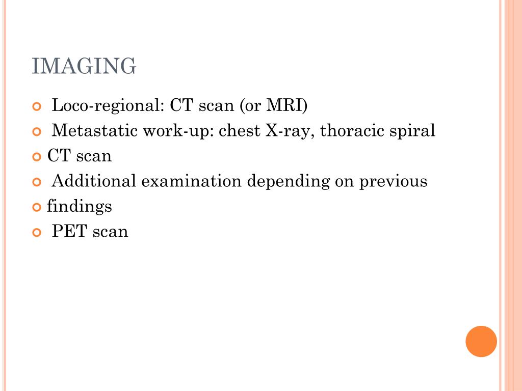 IMAGING • Loco-regional: CT scan (or MRI) • Metastatic work-up: chest X-ray, thoracic spiral • CT scan • Additional examination depending on previous • findings • PET scan