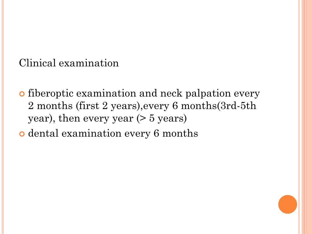 Clinical examination • fiberoptic examination and neck palpation every 2 months (first 2 years),every 6 months(3rd-5th year), then every year (> 5 years) • dental examination every 6 months
