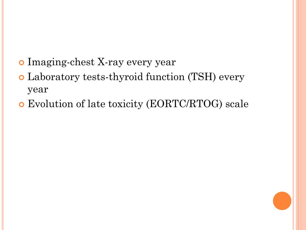 Imaging-chest X-ray every year • Laboratory tests-thyroid function (TSH) every year • Evolution of late toxicity (EORTC/RTOG) scale