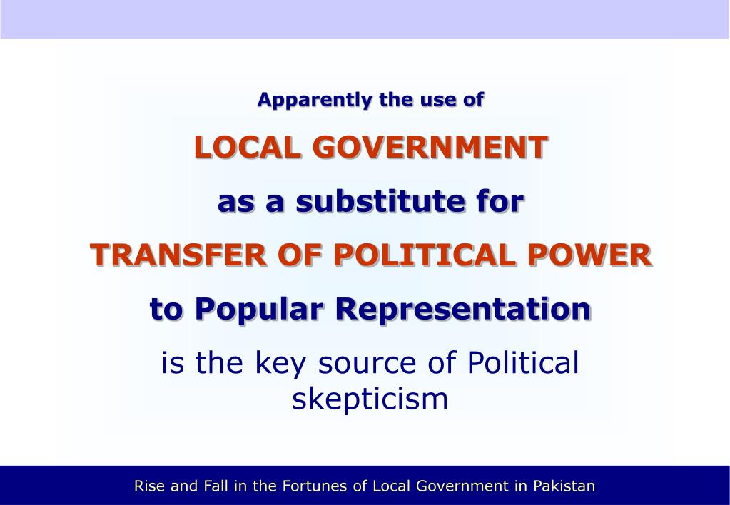 for different reasons during different periods Skepticism continued…….. British Period Substitute to Independence Ayub Martial Law Substitute to Adult Franchise Zia Martial Law Substitute to Holding National Elections Musharaf Government ?