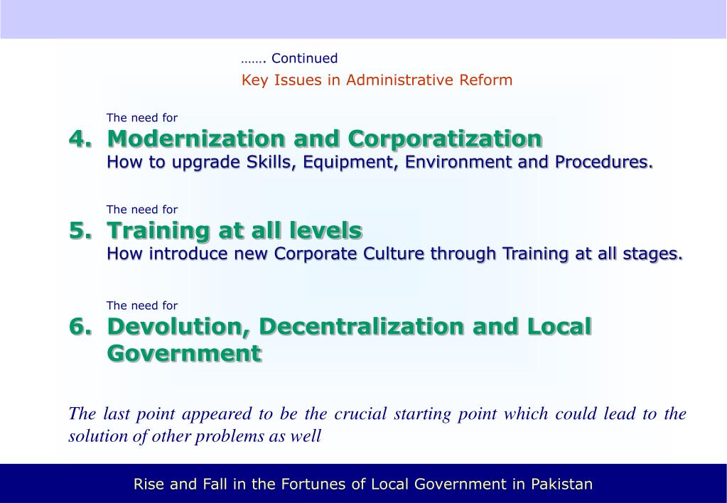 ……. Continued Key Issues in Administrative Reform The need for 4. Modernization and Corporatization How to upgrade Skills, Equipment, Environment and Procedures. The need for 5. Training at all levels How introduce new Corporate Culture through Training at all stages. The need for 6. Devolution, Decentralization and Local Government The last point appeared to be the crucial starting point which could lead to the solution of other problems as well