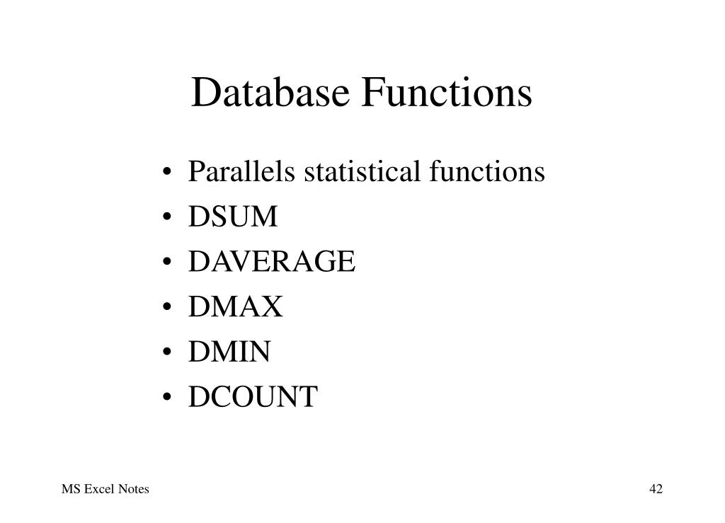 Database Functions • Parallels statistical functions • DSUM • DAVERAGE • DMAX • DMIN • DCOUNT
