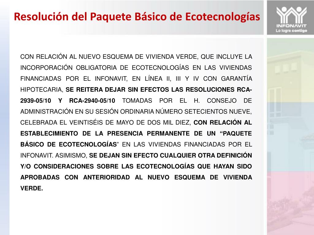 Resolución del Paquete Básico de Ecotecnologías CON RELACIÓN AL NUEVO ESQUEMA DE VIVIENDA VERDE, QUE INCLUYE LA INCORPORACIÓN OBLIGATORIA DE ECOTECNOLOGÍAS EN LAS VIVIENDAS FINANCIADAS POR EL INFONAVIT, EN LÍNEA II, III Y IV CON GARANTÍA HIPOTECARIA, SE REITERA DEJAR SIN EFECTOS LAS RESOLUCIONES RCA-2939-05/10 Y RCA-2940-05/10 TOMADAS POR EL H. CONSEJO DE ADMINISTRACIÓN EN SU SESIÓN ORDINARIA NÚMERO SETECIENTOS NUEVE, CELEBRADA EL VEINTISÉIS DE MAYO DE DOS MIL DIEZ, CON RELACIÓN AL ESTABLECIMIENTO DE LA PRESENCIA PERMANENTE DE UN “PAQUETE BÁSICO DE ECOTECNOLOGÍAS” EN LAS VIVIENDAS FINANCIADAS POR EL INFONAVIT. ASIMISMO, SE DEJAN SIN EFECTO CUALQUIER OTRA DEFINICIÓN Y/O CONSIDERACIONES SOBRE LAS ECOTECNOLOGÍAS QUE HAYAN SIDO APROBADAS CON ANTERIORIDAD AL NUEVO ESQUEMA DE VIVIENDA VERDE.