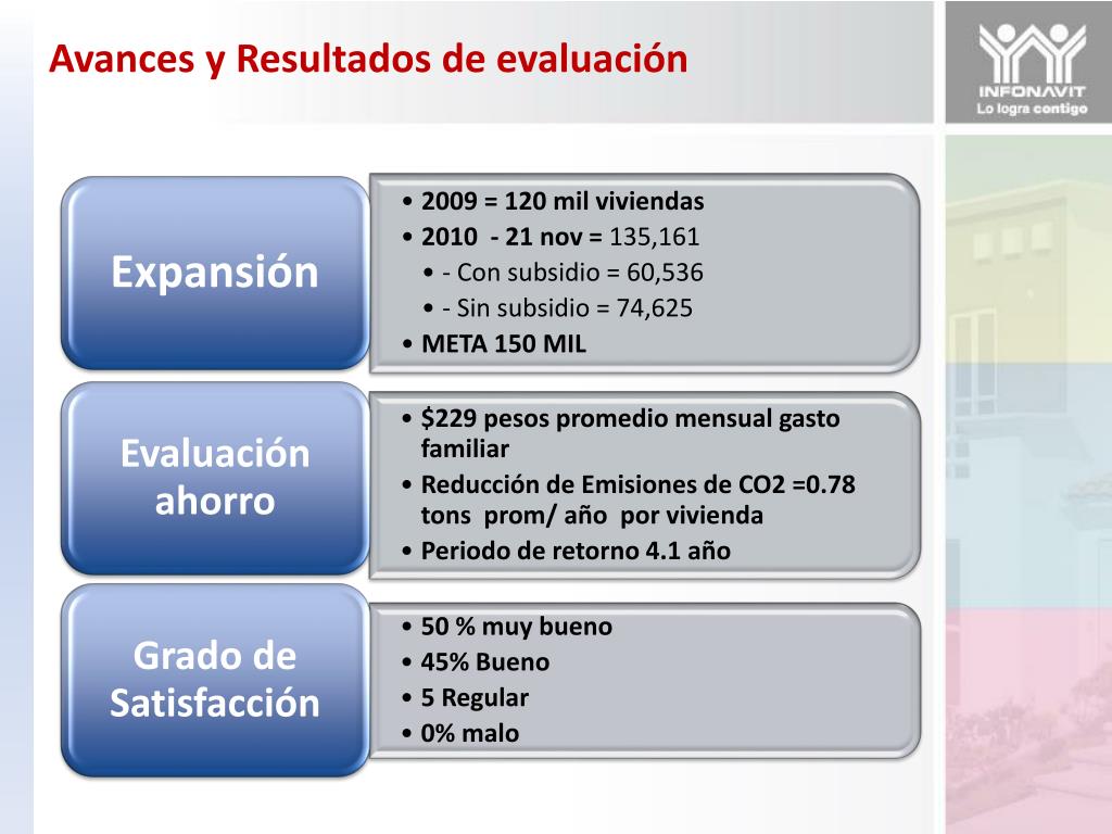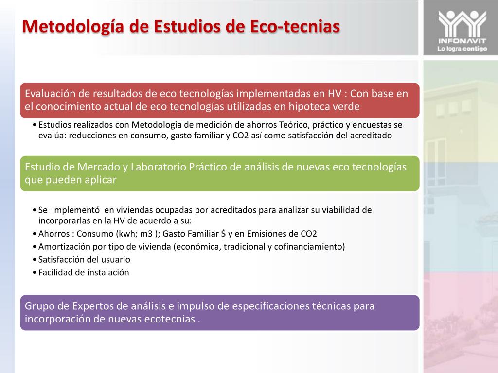Antecedentes • LAS ECOTECNOLOGÍAS QUE SE INCORPOREN EN LA VIVIENDA DEBERÁN GARANTIZAR UN AHORRO MÍNIMO PROGRESIVO LIGADO AL NIVEL DE INGRESO DEL TRABAJADOR, CONFORME A LA SIGUIENTE TABLA • Ahorro Mínimo (pesos) • Monto máximo de HV • Ingreso • De 1 a 6.99 VSM • 215 • Hasta 10 VSM • De 7 a 10.99 VSM • 290 • Hasta 15 VSM • De 11 VSM en adelante • 400 • Hasta 20 VSM