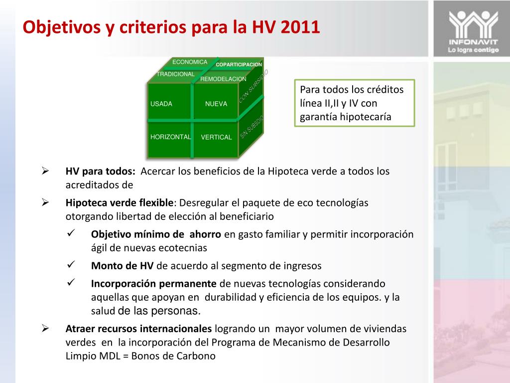 Objetivos y criterios para la HV 2011 ECONOMICA V COPARTICIPACION Para todos los créditos línea II,II y IV con garantía hipotecaría TRADICIONAL REMODELACION CON SUBSIDIO • HV para todos: Acercar los beneficios de la Hipoteca verde a todos los acreditados de • Hipoteca verde flexible: Desregular el paquete de eco tecnologías otorgando libertad de elección al beneficiario • Objetivo mínimo de ahorro en gasto familiar y permitir incorporación ágil de nuevas ecotecnias • Monto de HV de acuerdo al segmento de ingresos • Incorporación permanente de nuevas tecnologías considerando aquellas que apoyan en durabilidad y eficiencia de los equipos. y la salud de las personas. • Atraer recursos internacionales logrando un mayor volumen de viviendas verdes en la incorporación del Programa de Mecanismo de Desarrollo Limpio MDL = Bonos de Carbono USADA NUEVA SIN SUBSDIO HORIZONTAL VERTICAL
