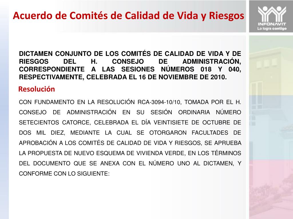 Acuerdo de Comités de Calidad de Vida y Riesgos DICTAMEN CONJUNTO DE LOS COMITÉS DE CALIDAD DE VIDA Y DE RIESGOS DEL H. CONSEJO DE ADMINISTRACIÓN, CORRESPONDIENTE A LAS SESIONES NÚMEROS 018 Y 040, RESPECTIVAMENTE, CELEBRADA EL 16 DE NOVIEMBRE DE 2010. CON FUNDAMENTO EN LA RESOLUCIÓN RCA-3094-10/10, TOMADA POR EL H. CONSEJO DE ADMINISTRACIÓN EN SU SESIÓN ORDINARIA NÚMERO SETECIENTOS CATORCE, CELEBRADA EL DÍA VEINTISIETE DE OCTUBRE DE DOS MIL DIEZ, MEDIANTE LA CUAL SE OTORGARON FACULTADES DE APROBACIÓN A LOS COMITÉS DE CALIDAD DE VIDA Y RIESGOS, SE APRUEBA LA PROPUESTA DE NUEVO ESQUEMA DE VIVIENDA VERDE, EN LOS TÉRMINOS DEL DOCUMENTO QUE SE ANEXA CON EL NÚMERO UNO AL DICTAMEN, Y CONFORME CON LO SIGUIENTE: • Resolución