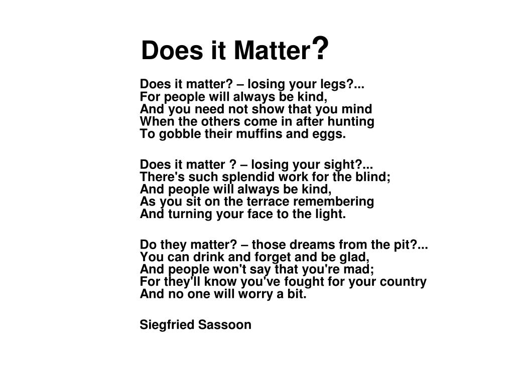 Does it Matter? Does it matter? – losing your legs?...For people will always be kind,And you need not show that you mindWhen the others come in after huntingTo gobble their muffins and eggs. Does it matter ? – losing your sight?...There's such splendid work for the blind;And people will always be kind,As you sit on the terrace rememberingAnd turning your face to the light. Do they matter? – those dreams from the pit?...You can drink and forget and be glad,And people won't say that you're mad;For they'll know you've fought for your countryAnd no one will worry a bit. Siegfried Sassoon