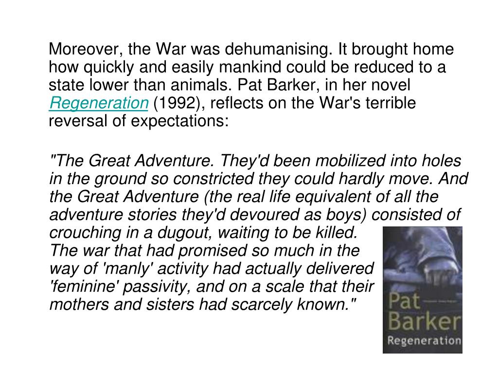 Moreover, the War was dehumanising. It brought home how quickly and easily mankind could be reduced to a state lower than animals. Pat Barker, in her novel Regeneration (1992), reflects on the War's terrible reversal of expectations: "The Great Adventure. They'd been mobilized into holes in the ground so constricted they could hardly move. And the Great Adventure (the real life equivalent of all the adventure stories they'd devoured as boys) consisted of crouching in a dugout, waiting to be killed. The war that had promised so much in the way of 'manly' activity had actually delivered 'feminine' passivity, and on a scale that their mothers and sisters had scarcely known."