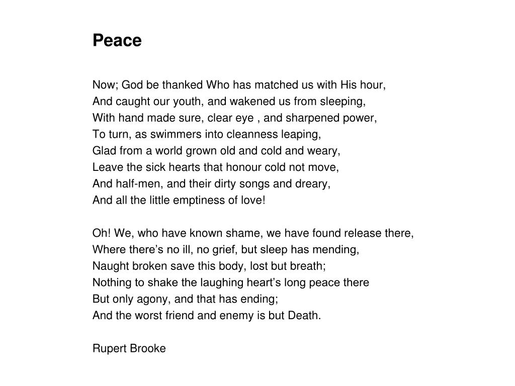 Peace Now; God be thanked Who has matched us with His hour, And caught our youth, and wakened us from sleeping, With hand made sure, clear eye , and sharpened power, To turn, as swimmers into cleanness leaping, Glad from a world grown old and cold and weary, Leave the sick hearts that honour cold not move, And half-men, and their dirty songs and dreary, And all the little emptiness of love! Oh! We, who have known shame, we have found release there, Where there’s no ill, no grief, but sleep has mending, Naught broken save this body, lost but breath; Nothing to shake the laughing heart’s long peace there But only agony, and that has ending; And the worst friend and enemy is but Death. Rupert Brooke