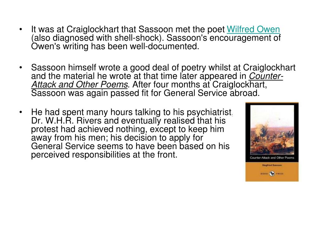 It was at Craiglockhart that Sassoon met the poet Wilfred Owen (also diagnosed with shell-shock). Sassoon's encouragement of Owen's writing has been well-documented. • Sassoon himself wrote a good deal of poetry whilst at Craiglockhart and the material he wrote at that time later appeared in Counter-Attack and Other Poems. After four months at Craiglockhart, Sassoon was again passed fit for General Service abroad. • He had spent many hours talking to his psychiatrist, Dr. W.H.R. Rivers and eventually realised that his protest had achieved nothing, except to keep him away from his men; his decision to apply for General Service seems to have been based on his perceived responsibilities at the front.
