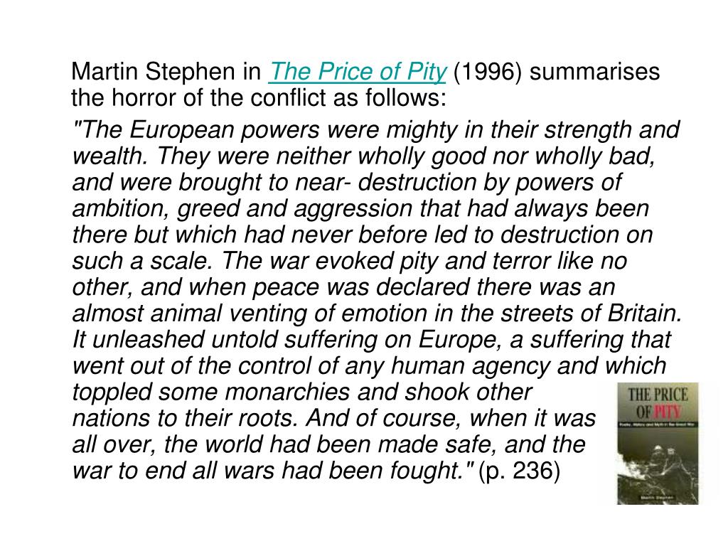 Martin Stephen in The Price of Pity (1996) summarises the horror of the conflict as follows: "The European powers were mighty in their strength and wealth. They were neither wholly good nor wholly bad, and were brought to near- destruction by powers of ambition, greed and aggression that had always been there but which had never before led to destruction on such a scale. The war evoked pity and terror like no other, and when peace was declared there was an almost animal venting of emotion in the streets of Britain. It unleashed untold suffering on Europe, a suffering that went out of the control of any human agency and which toppled some monarchies and shook other nations to their roots. And of course, when it was all over, the world had been made safe, and the war to end all wars had been fought." (p. 236)