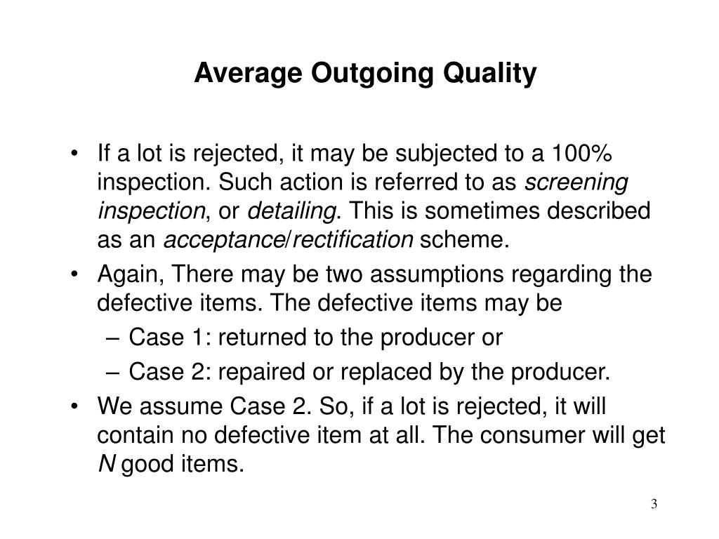 Average Outgoing Quality. Outline Average Outgoing Quality (AOQ) Average Outgoing Quality Limit (AOQL) Average Total Inspection (ATI) Average Fraction Inspected (AFI). Average Outgoing Quality.