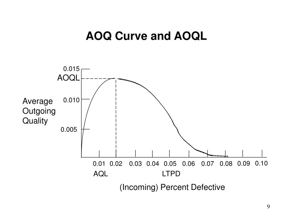 AOQ Curve and AOQL 0.015 AOQL 0.010 Average Outgoing Quality 0.005 0.10 0.09 0.01 0.02 0.03 0.04 0.05 0.06 0.07 0.08 AQL LTPD (Incoming) Percent Defective