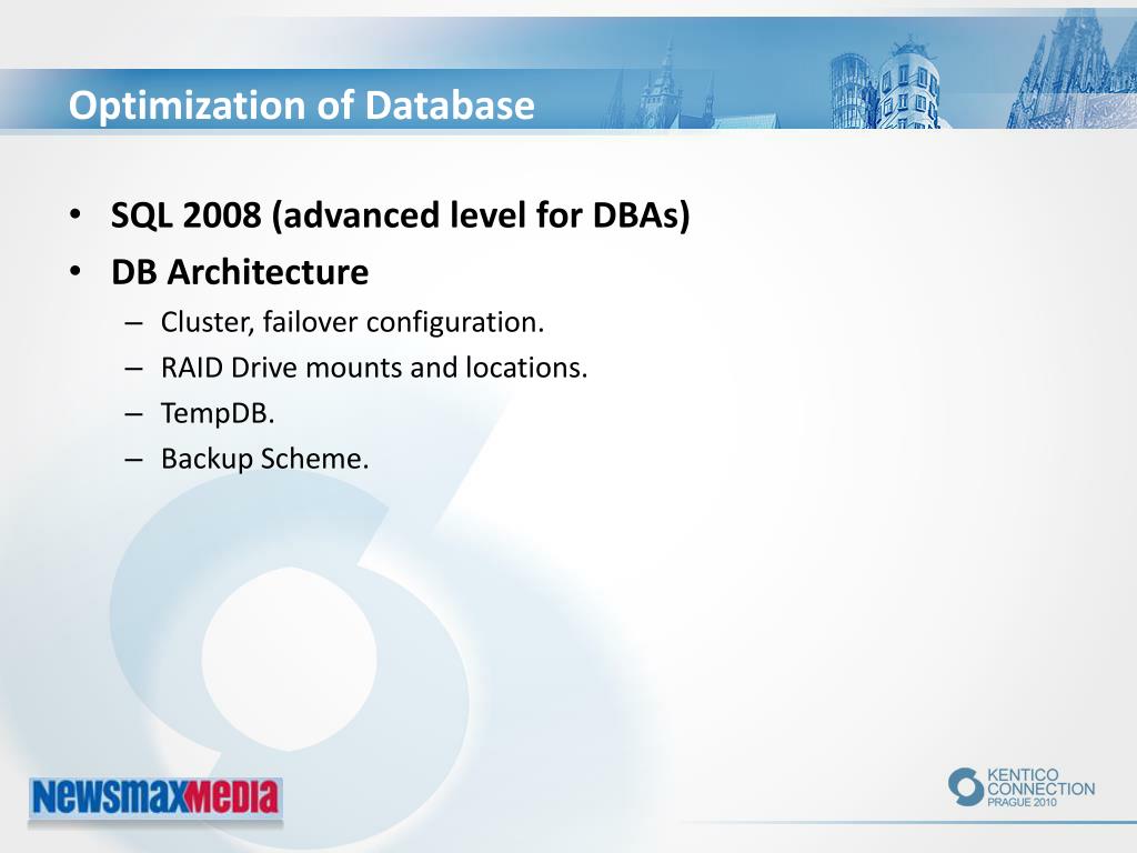 Optimization of Database • SQL 2008 (advanced level for DBAs) • DB Architecture • Cluster, failover configuration. • RAID Drive mounts and locations. • TempDB. • Backup Scheme.