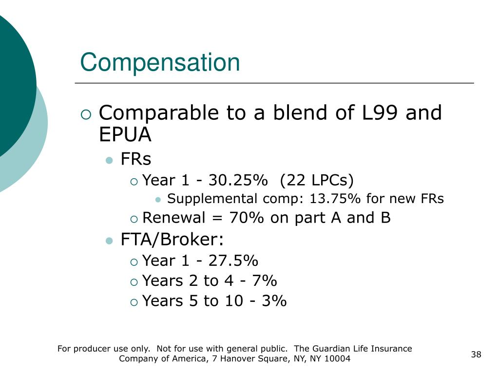 Compensation • Comparable to a blend of L99 and EPUA • FRs • Year 1 - 30.25% (22 LPCs) • Supplemental comp: 13.75% for new FRs • Renewal = 70% on part A and B • FTA/Broker: • Year 1 - 27.5% • Years 2 to 4 - 7% • Years 5 to 10 - 3% For producer use only. Not for use with general public. The Guardian Life Insurance Company of America, 7 Hanover Square, NY, NY 10004
