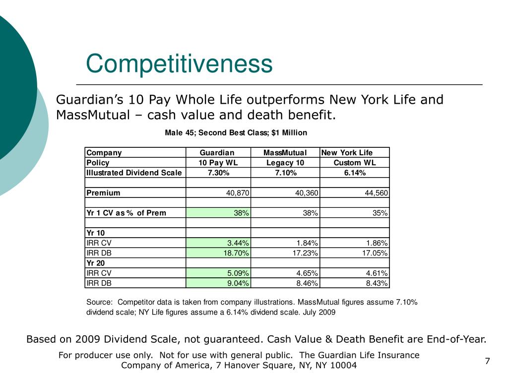 Competitiveness Guardian’s 10 Pay Whole Life outperforms New York Life and MassMutual – cash value and death benefit. Based on 2009 Dividend Scale, not guaranteed. Cash Value & Death Benefit are End-of-Year. For producer use only. Not for use with general public. The Guardian Life Insurance Company of America, 7 Hanover Square, NY, NY 10004