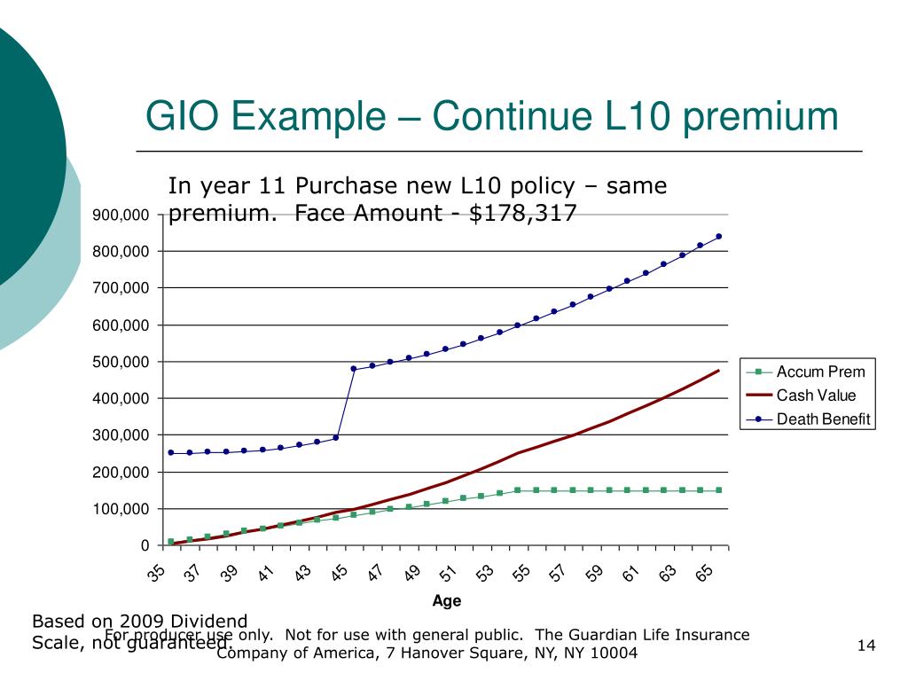 GIO Example – Continue L10 premium In year 11 Purchase new L10 policy – same premium. Face Amount - $178,317 Based on 2009 Dividend Scale, not guaranteed. For producer use only. Not for use with general public. The Guardian Life Insurance Company of America, 7 Hanover Square, NY, NY 10004