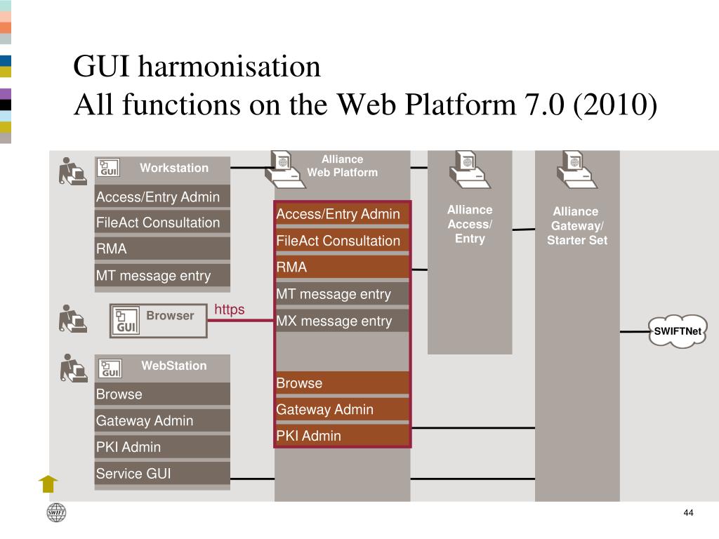 SWIFTNet Browser GUI harmonisationIntroduction of Web Platform 6.3 (2009) Alliance Access/ Entry Alliance Gateway/ Starter Set Workstation Alliance Web Platform Access/Entry Admin FileAct Consultation FileAct Consultation RMA RMA MT message entry MT message entry https MX message entry WebStation Browse Browse Gateway Admin Gateway Admin PKI Admin Service GUI