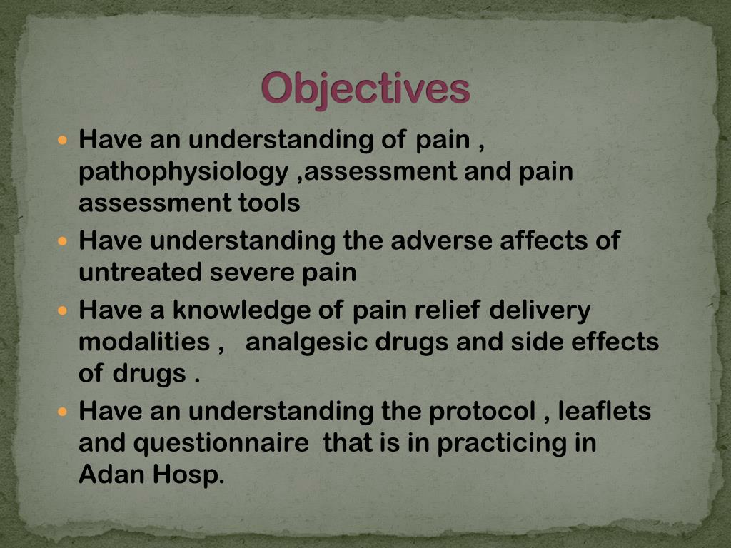 Objectives • Have an understanding of pain , pathophysiology ,assessment and pain assessment tools • Have understanding the adverse affects of untreated severe pain • Have a knowledge of pain relief delivery modalities , analgesic drugs and side effects of drugs . • Have an understanding the protocol , leaflets and questionnaire that is in practicing in Adan Hosp.