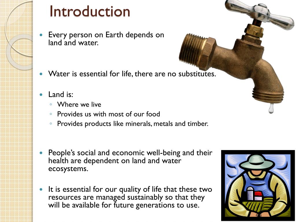 Introduction • Every person on Earth depends on land and water. • Water is essential for life, there are no substitutes. • Land is: • Where we live • Provides us with most of our food • Provides products like minerals, metals and timber. • People’s social and economic well-being and their health are dependent on land and water ecosystems. • It is essential for our quality of life that these two resources are managed sustainably so that they will be available for future generations to use.