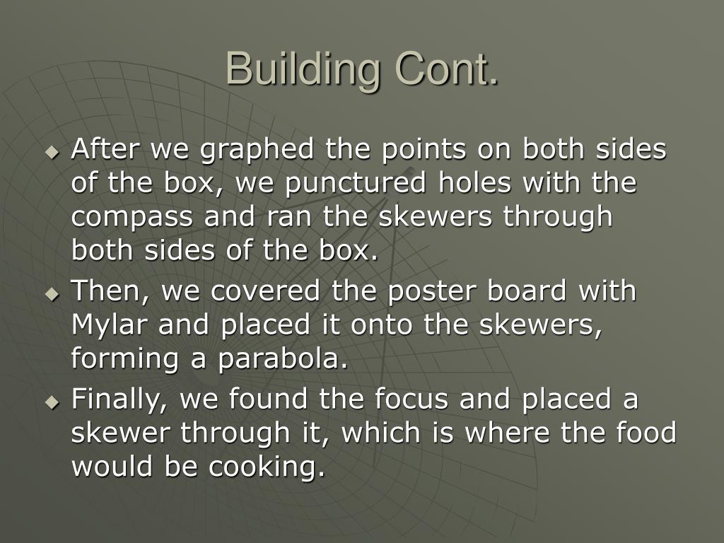 Building Cont. • After we graphed the points on both sides of the box, we punctured holes with the compass and ran the skewers through both sides of the box. • Then, we covered the poster board with Mylar and placed it onto the skewers, forming a parabola. • Finally, we found the focus and placed a skewer through it, which is where the food would be cooking.