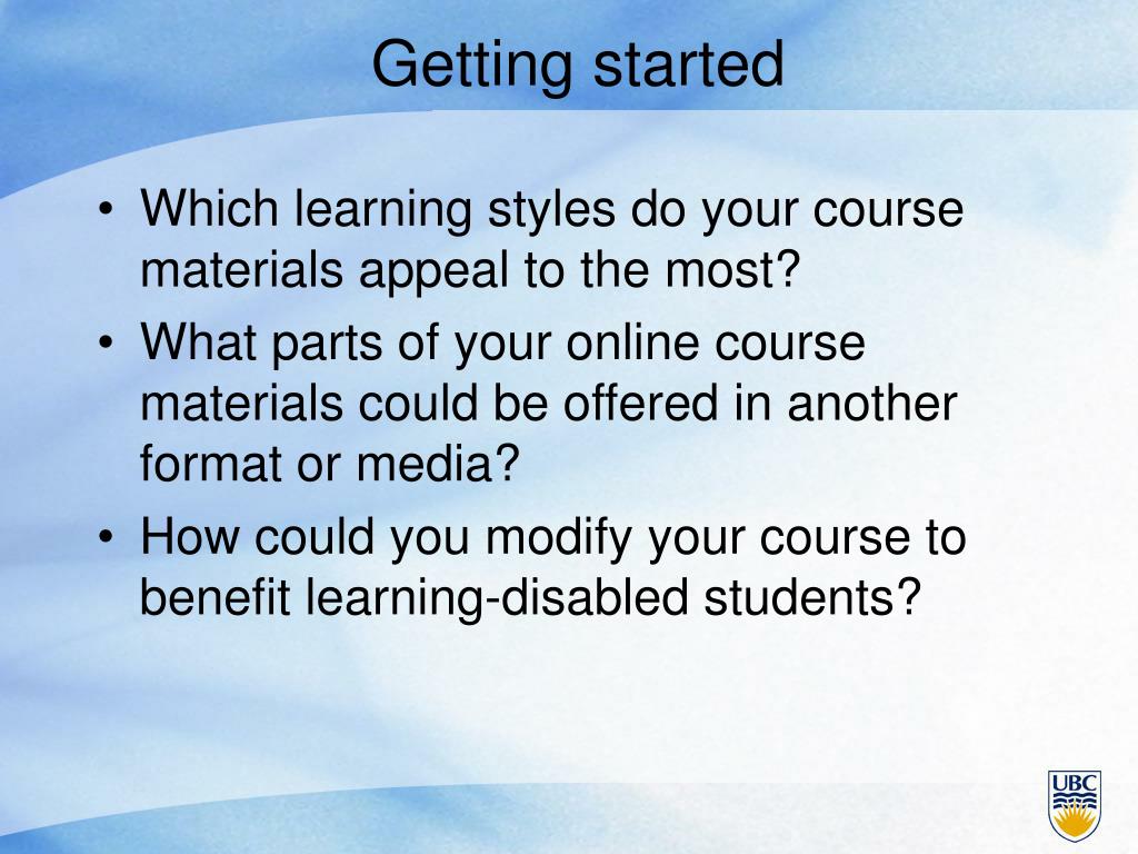 Getting started • Which learning styles do your course materials appeal to the most? • What parts of your online course materials could be offered in another format or media? • How could you modify your course to benefit learning-disabled students?