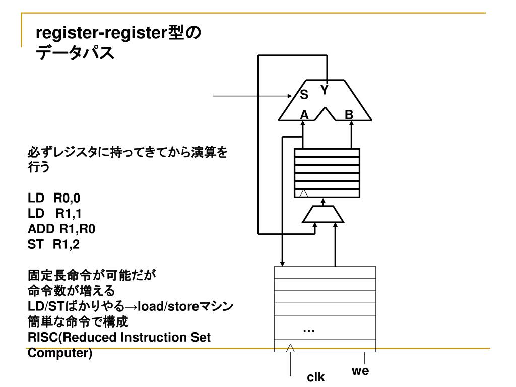 register-register型の データパス Y S A B 必ずレジスタに持ってきてから演算を行う LDR0,0 LD R1,1 ADD R1,R0 STR1,2 固定長命令が可能だが 命令数が増える LD/STばかりやる→load/storeマシン 簡単な命令で構成 RISC(Reduced Instruction Set Computer) … we clk