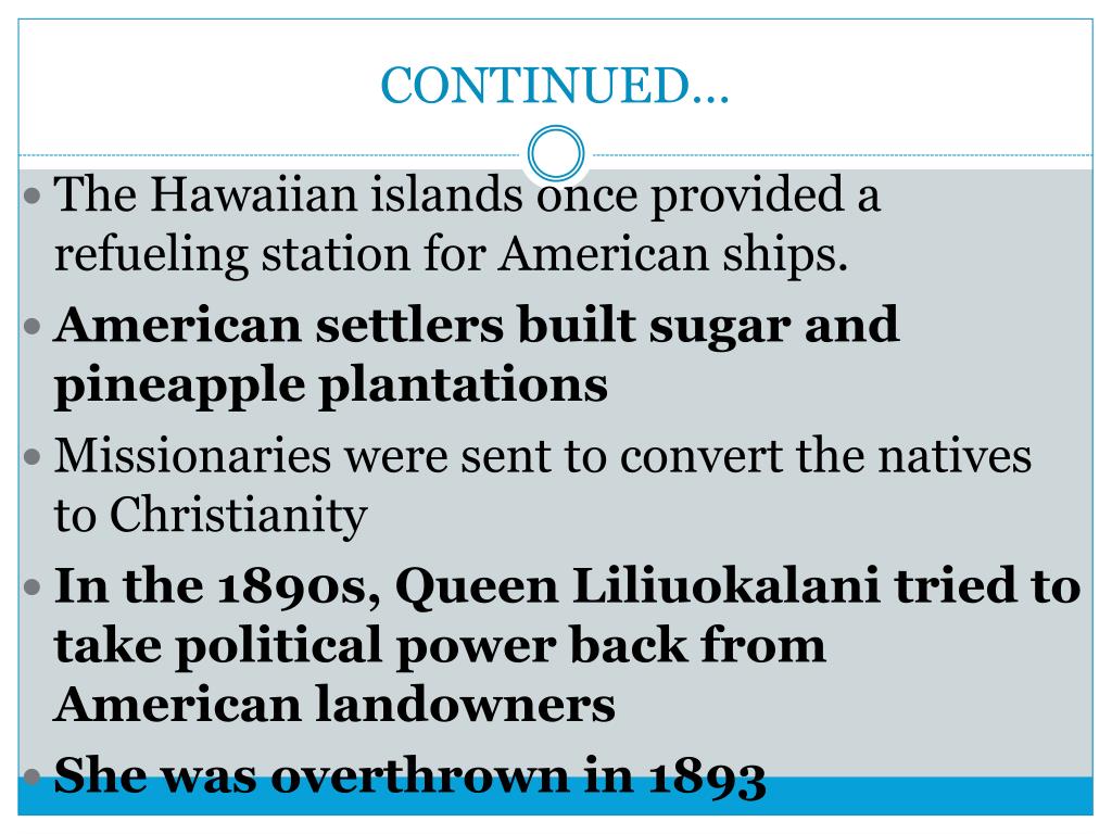 CONTINUED… The Hawaiian islands once provided a refueling station for American ships. American settlers built sugar and pineapple plantations Missionaries were sent to convert the natives to Christianity In the 1890s, Queen Liliuokalani tried to take political power back from American landowners She was overthrown in 1893