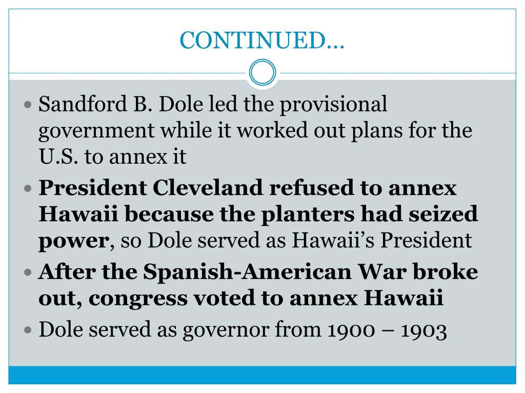 CONTINUED… Sandford B. Dole led the provisional government while it worked out plans for the U.S. to annex it President Cleveland refused to annex Hawaii because the planters had seized power, so Dole served as Hawaii’s President After the Spanish-American War broke out, congress voted to annex Hawaii Dole served as governor from 1900 – 1903