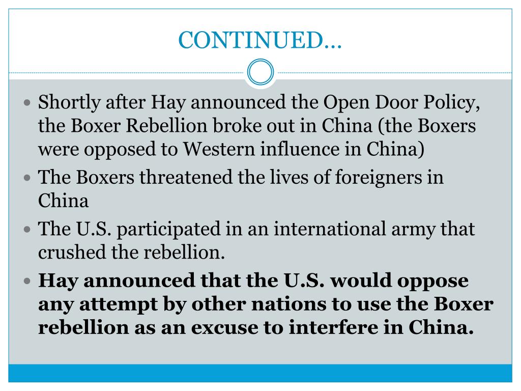 CONTINUED… Shortly after Hay announced the Open Door Policy, the Boxer Rebellion broke out in China (the Boxers were opposed to Western influence in China) The Boxers threatened the lives of foreigners in China The U.S. participated in an international army that crushed the rebellion. Hay announced that the U.S. would oppose any attempt by other nations to use the Boxer rebellion as an excuse to interfere in China.