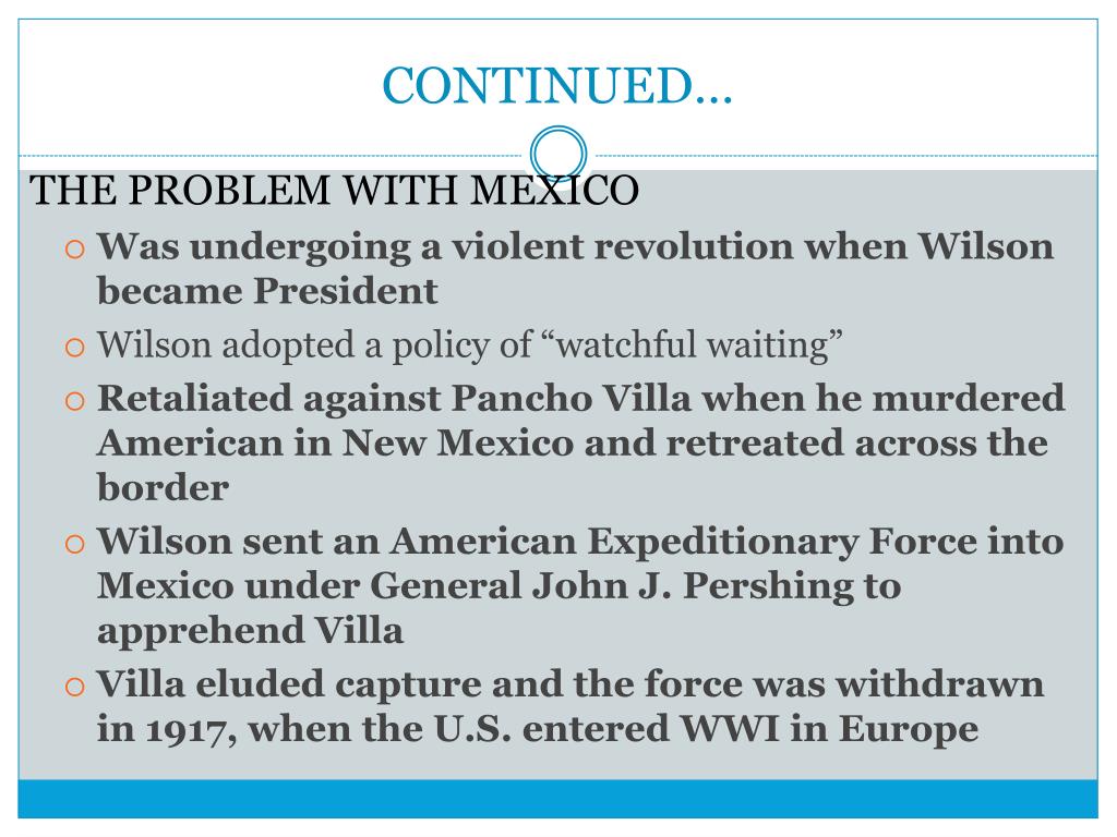 CONTINUED… THE PROBLEM WITH MEXICO • Was undergoing a violent revolution when Wilson became President • Wilson adopted a policy of “watchful waiting” • Retaliated against Pancho Villa when he murdered American in New Mexico and retreated across the border • Wilson sent an American Expeditionary Force into Mexico under General John J. Pershing to apprehend Villa • Villa eluded capture and the force was withdrawn in 1917, when the U.S. entered WWI in Europe