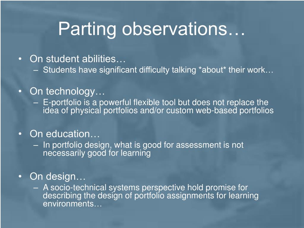 Parting observations… • On student abilities… • Students have significant difficulty talking *about* their work… • On technology… • E-portfolio is a powerful flexible tool but does not replace the idea of physical portfolios and/or custom web-based portfolios • On education… • In portfolio design, what is good for assessment is not necessarily good for learning • On design… • A socio-technical systems perspective hold promise for describing the design of portfolio assignments for learning environments…