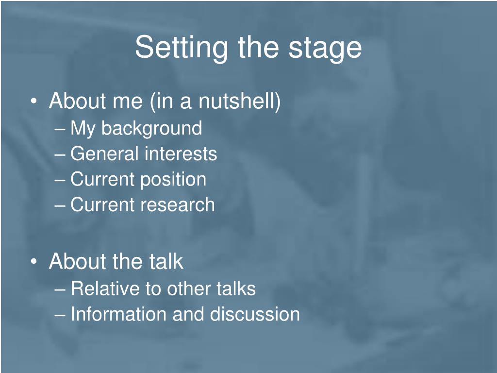 Setting the stage • About me (in a nutshell) • My background • General interests • Current position • Current research • About the talk • Relative to other talks • Information and discussion