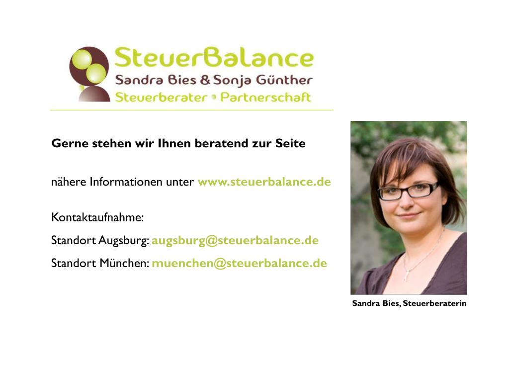 Gerne stehen wir Ihnen beratend zur Seite nähere Informationen unter www.steuerbalance.de Kontaktaufnahme: Standort Augsburg: augsburg@steuerbalance.de Standort München: muenchen@steuerbalance.de Sandra Bies, Steuerberaterin