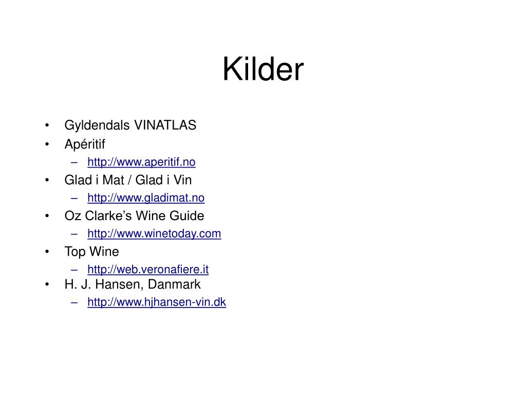 Kilder • Gyldendals VINATLAS • Apéritif • http://www.aperitif.no • Glad i Mat / Glad i Vin • http://www.gladimat.no • Oz Clarke’s Wine Guide • http://www.winetoday.com • Top Wine • http://web.veronafiere.it • H. J. Hansen, Danmark • http://www.hjhansen-vin.dk