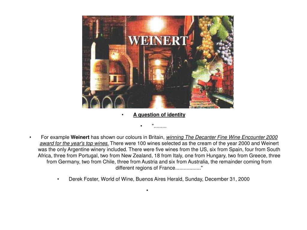 A question of identity • "......... • For example Weinert has shown our colours in Britain, winning The Decanter Fine Wine Encounter 2000 award for the year's top wines. There were 100 wines selected as the cream of the year 2000 and Weinert was the only Argentine winery included. There were five wines from the US, six from Spain, four from South Africa, three from Portugal, two from New Zealand, 18 from Italy, one from Hungary, two from Greece, three from Germany, two from Chile, three from Austria and six from Australia, the remainder coming from different regions of France.................." • Derek Foster, World of Wine, Buenos Aires Herald, Sunday, December 31, 2000