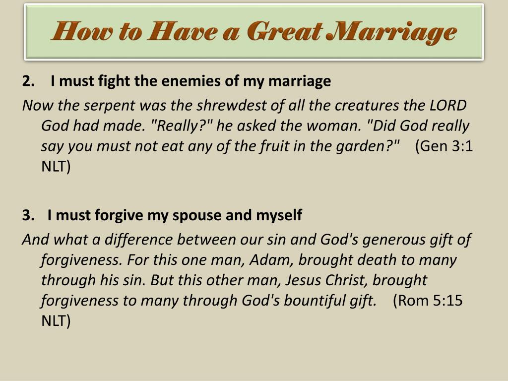 How to Have a Great Marriage • I must fight the enemies of my marriage Now the serpent was the shrewdest of all the creatures the LORD God had made. "Really?" he asked the woman. "Did God really say you must not eat any of the fruit in the garden?" (Gen 3:1 NLT) • I must forgive my spouse and myself And what a difference between our sin and God's generous gift of forgiveness. For this one man, Adam, brought death to many through his sin. But this other man, Jesus Christ, brought forgiveness to many through God's bountiful gift. (Rom 5:15 NLT)