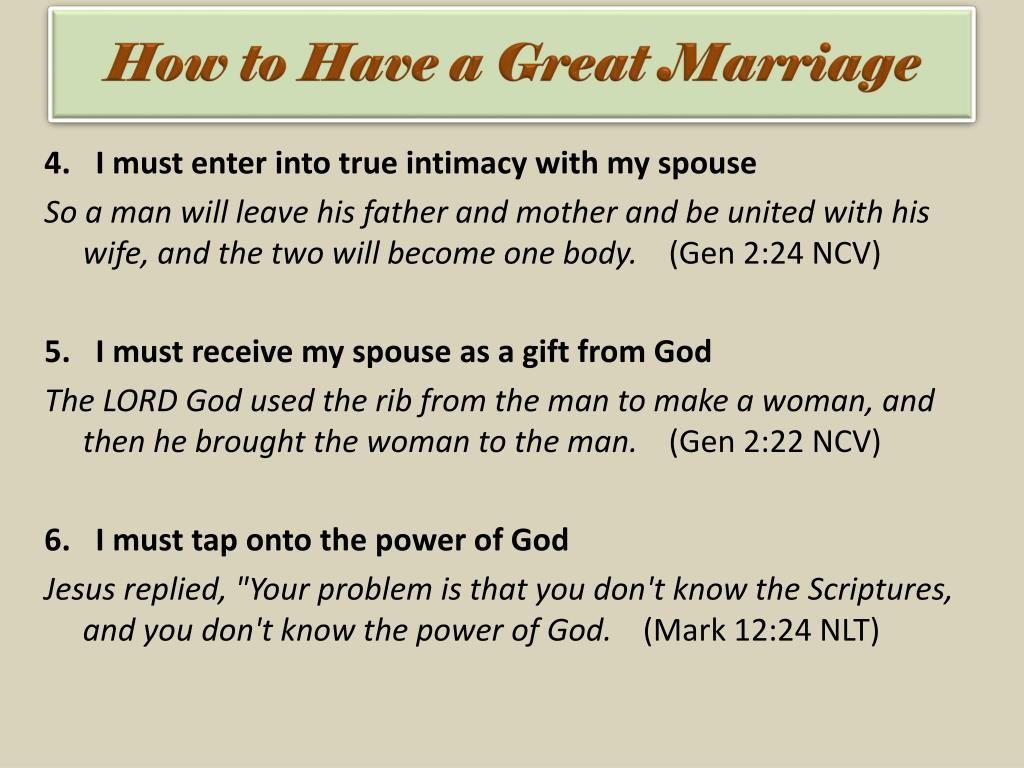 How to Have a Great Marriage • I must enter into true intimacy with my spouse So a man will leave his father and mother and be united with his wife, and the two will become one body. (Gen 2:24 NCV) • I must receive my spouse as a gift from God The LORD God used the rib from the man to make a woman, and then he brought the woman to the man. (Gen 2:22 NCV) • I must tap onto the power of God Jesus replied, "Your problem is that you don't know the Scriptures, and you don't know the power of God. (Mark 12:24 NLT)