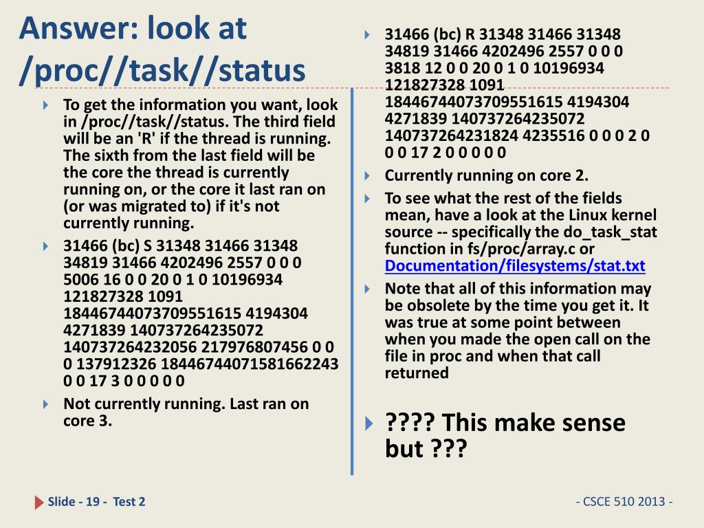 Answer: look at/proc//task//status To get the information you want, look in /proc//task//status. The third field will be an 'R' if the thread is running. The sixth from the last field will be the core the thread is currently running on, or the core it last ran on (or was migrated to) if it's not currently running. 31466 (bc) S 31348 31466 31348 34819 31466 4202496 2557 0 0 0 5006 16 0 0 20 0 1 0 10196934 121827328 1091 18446744073709551615 4194304 4271839 140737264235072 140737264232056 217976807456 0 0 0 137912326 18446744071581662243 0 0 17 3 0 0 0 0 0 Not currently running. Last ran on core 3. 31466 (bc) R 31348 31466 31348 34819 31466 4202496 2557 0 0 0 3818 12 0 0 20 0 1 0 10196934 121827328 1091 18446744073709551615 4194304 4271839 140737264235072 140737264231824 4235516 0 0 0 2 0 0 0 17 2 0 0 0 0 0 Currently running on core 2. To see what the rest of the fields mean, have a look at the Linux kernel source -- specifically the do_task_stat function in fs/proc/array.c or Documentation/filesystems/stat.txt Note that all of this information may be obsolete by the time you get it. It was true at some point between when you made the open call on the file in proc and when that call returned ???? This make sense but ???