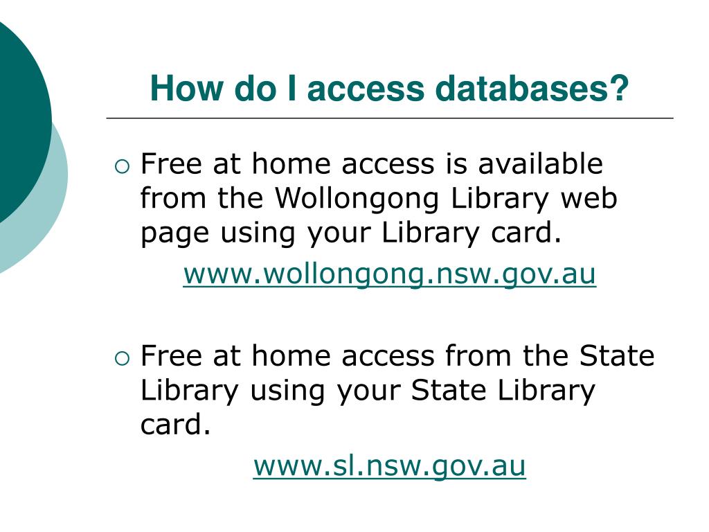 How do I access databases? • Free at home access is available from the Wollongong Library web page using your Library card. www.wollongong.nsw.gov.au • Free at home access from the State Library using your State Library card. www.sl.nsw.gov.au