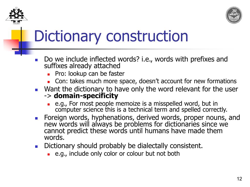 Dictionary construction • Do we include inflected words? i.e., words with prefixes and suffixes already attached • Pro: lookup can be faster • Con: takes much more space, doesn’t account for new formations • Want the dictionary to have only the word relevant for the user -> domain-specificity • e.g., For most people memoize is a misspelled word, but in computer science this is a technical term and spelled correctly. • Foreign words, hyphenations, derived words, proper nouns, and new words will always be problems for dictionaries since we cannot predict these words until humans have made them words. • Dictionary should probably be dialectally consistent. • e.g., include only color or colour but not both
