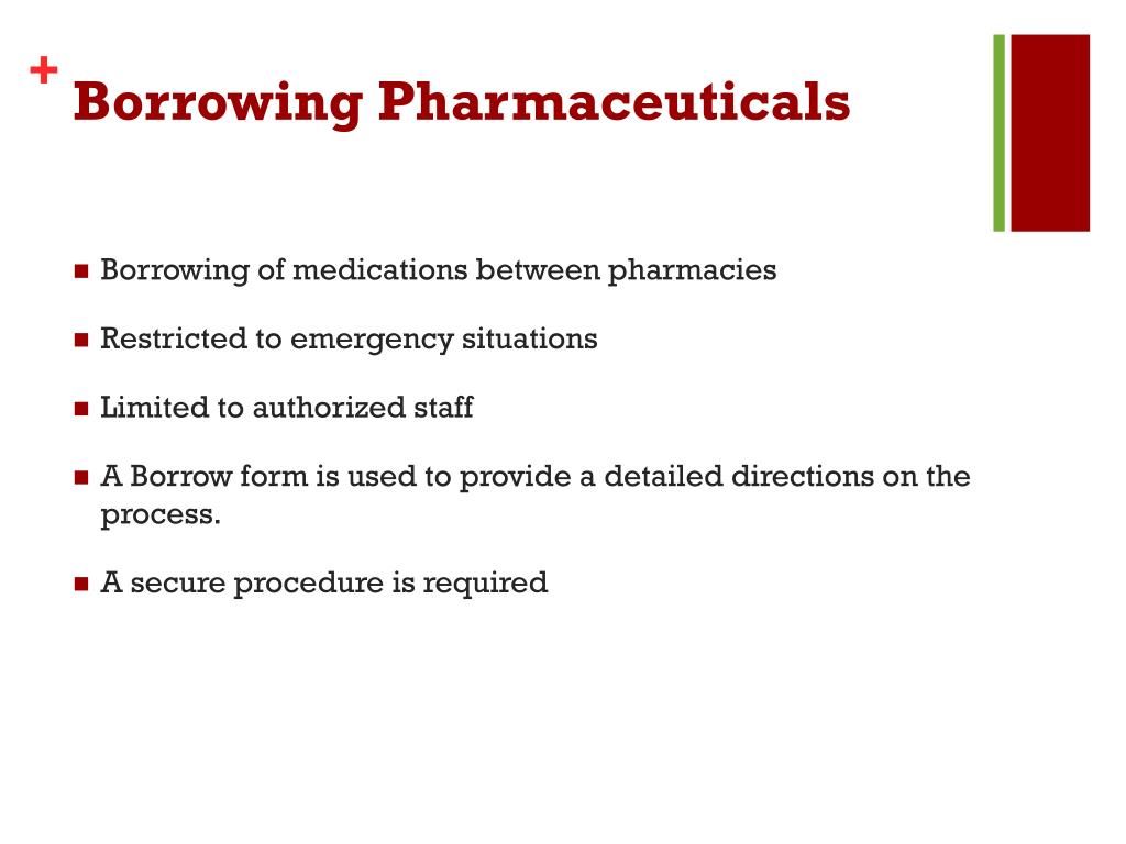 Borrowing Pharmaceuticals • Borrowing of medications between pharmacies • Restricted to emergency situations • Limited to authorized staff • A Borrow form is used to provide a detailed directions on the process. • A secure procedure is required