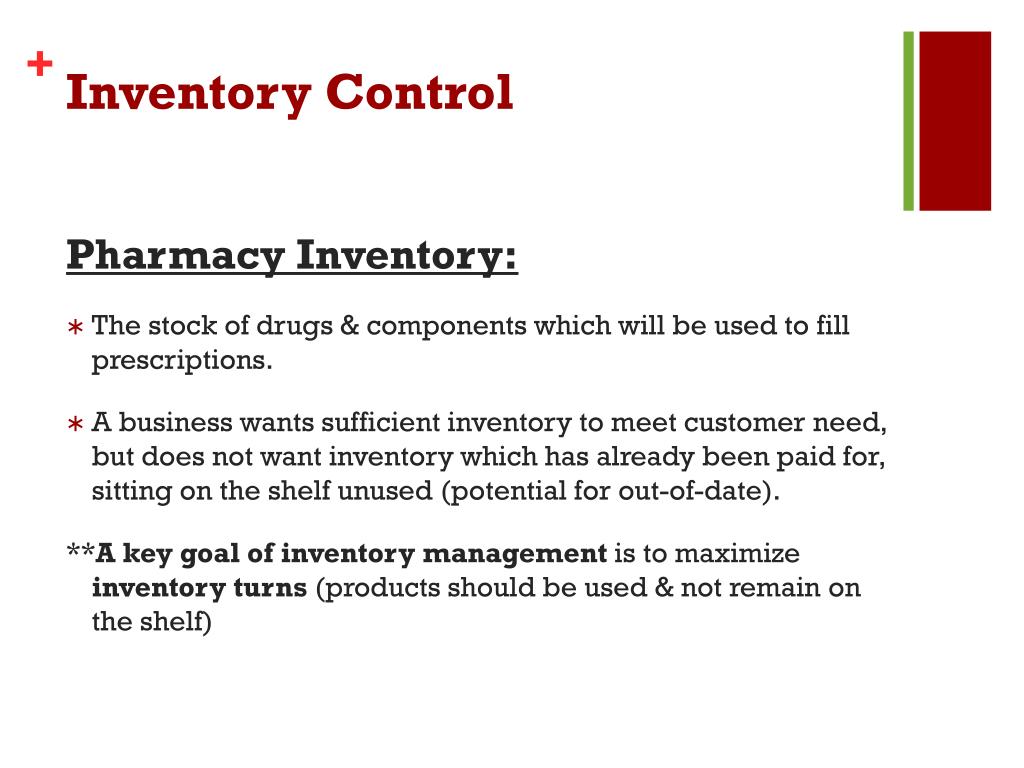 Inventory Control Pharmacy Inventory: • The stock of drugs & components which will be used to fill prescriptions. • A business wants sufficient inventory to meet customer need, but does not want inventory which has already been paid for, sitting on the shelf unused(potential for out-of-date). **A key goal of inventory management is to maximizeinventory turns (products should be used & not remainon the shelf)