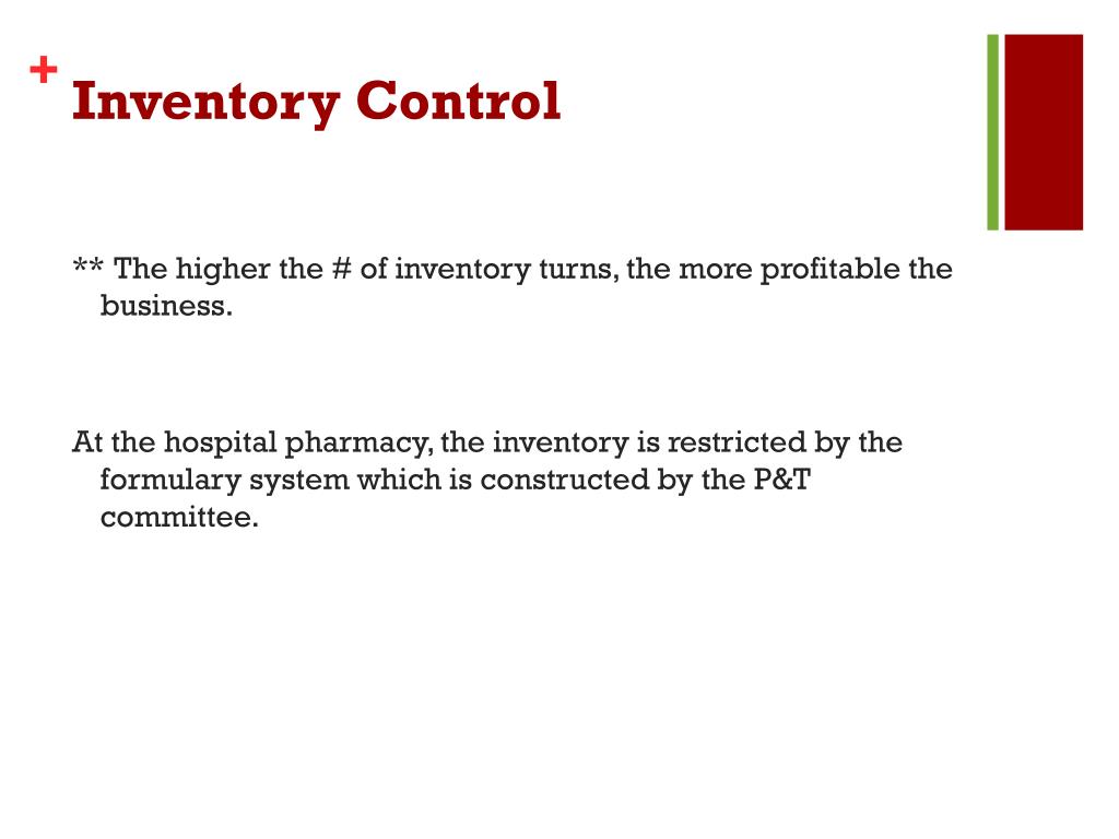 Inventory Control **The higher the # of inventory turns, the more profitable the business. At the hospital pharmacy, the inventory is restricted by the formulary system which is constructed by the P&T committee.