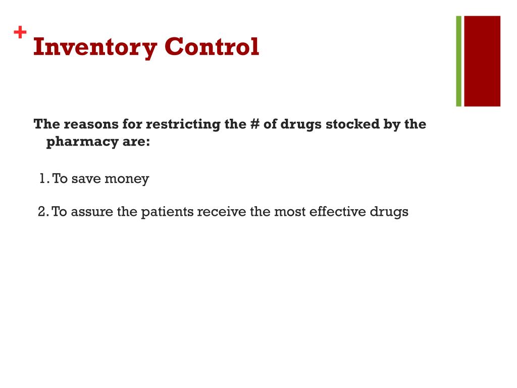 Inventory Control The reasons for restricting the # of drugs stocked by the pharmacy are: 1. To save money 2. To assure the patients receive the most effective drugs