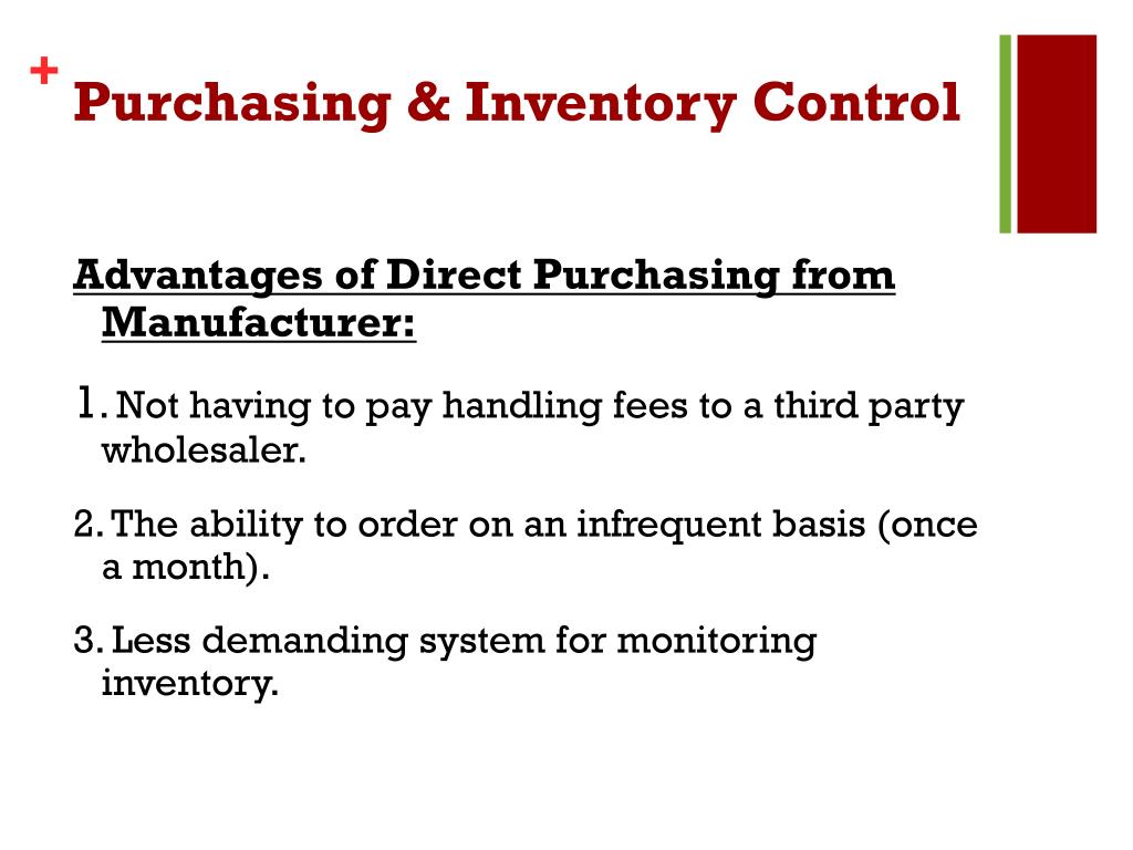 Purchasing & Inventory Control Advantages of Direct Purchasing from Manufacturer: 1. Not having to pay handling fees to a third party wholesaler. 2. The ability to order on an infrequent basis (once a month). 3. Less demanding system for monitoring inventory.