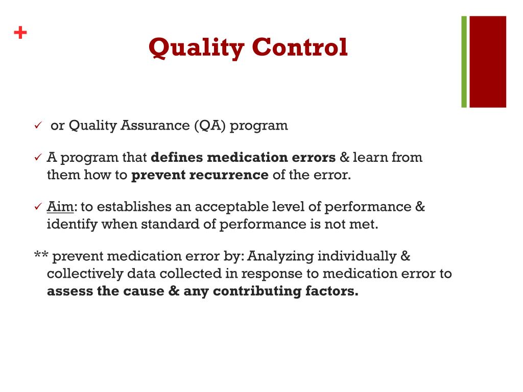 Quality Control • or Quality Assurance (QA) program • A program that defines medication errors& learn from them how to prevent recurrence of the error. • Aim: to establishes an acceptable level of performance & identify when standard of performance is not met. ** prevent medication error by: Analyzing individually & collectively data collected in response tomedication error to assess the cause & any contributing factors.