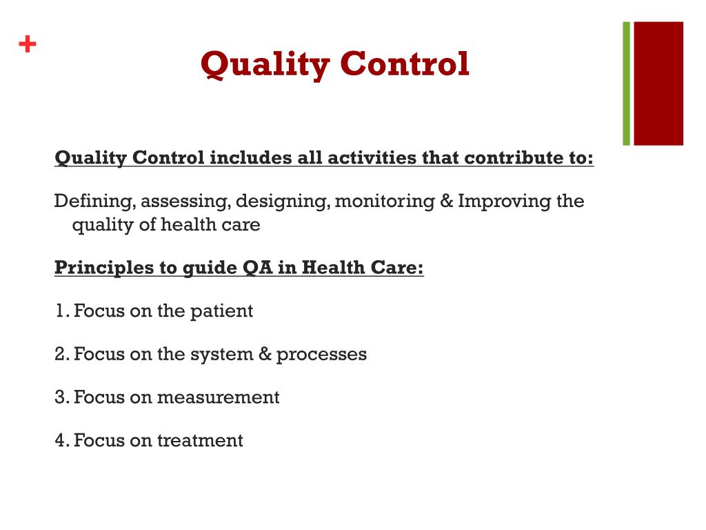 Quality Control Quality Control includes all activities that contribute to: Defining, assessing, designing, monitoring & Improving the quality of health care Principles to guide QA in Health Care: 1. Focus on the patient 2. Focus on the system & processes 3. Focus on measurement 4. Focus on treatment
