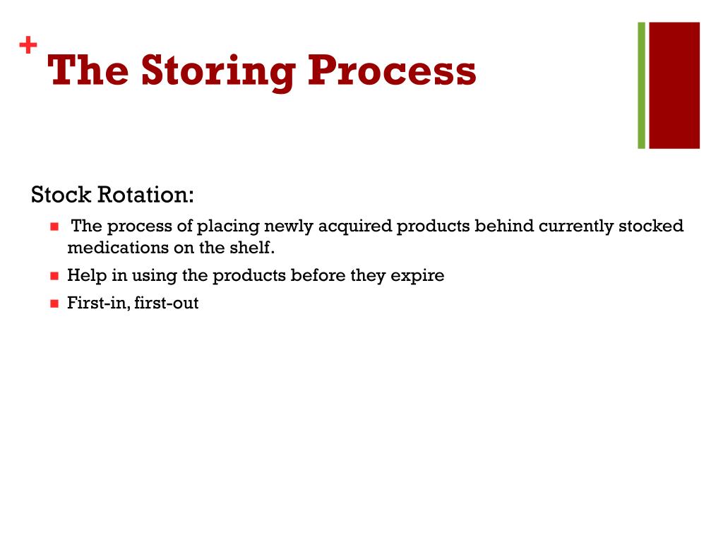 The Storing Process Stock Rotation: • The process of placing newly acquired products behind currently stocked medications on the shelf. • Help in using the products before they expire • First-in, first-out